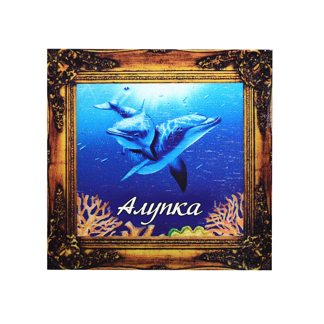 "Дельфіни" магніт — картина Алупка 70х70 мм. Пряме нанесення на дерево,прямий повноколірний друк, об'ємна рамка, не блякне, не боїться вологи.